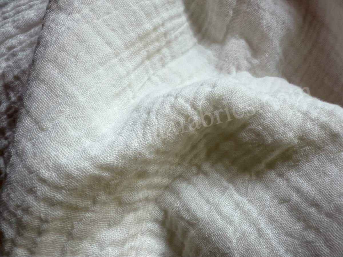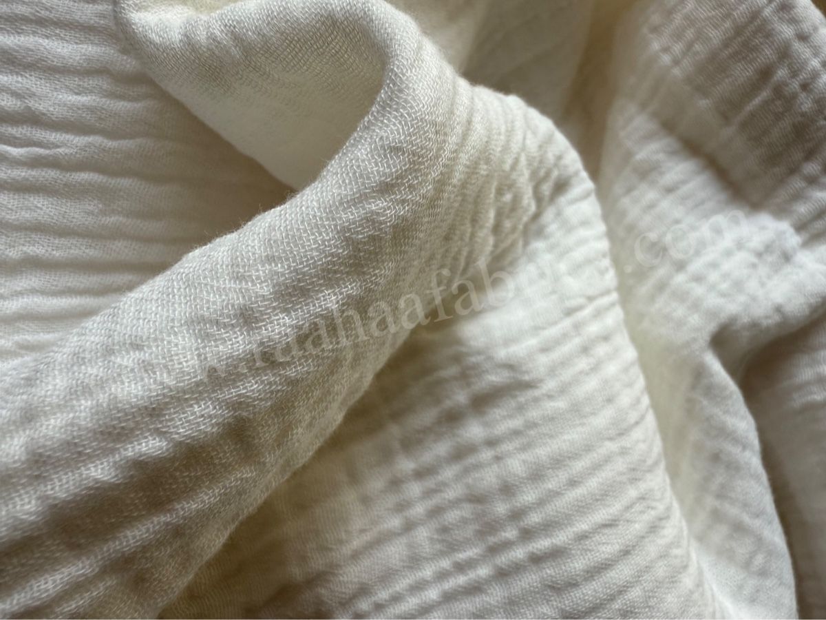 Our organic double cotton muslin gauze crinkle fabric has an extremely soft and plush double cotton fabric with a woven texture that is breathable to the skin while also being hypoallergenic. It is perfect for crafting baby wear and breathable summer dresses. You can check more of our sustainable fabrics range here.